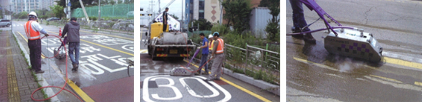 특허 제10-1131515호 워터 제트를 이용한 노면표시 제거장치는 도로상에 도색된 노면표시의 제거는 물론 주변 도로의 표면 손상 을 억제할 수 있는 동시에 분진의 발생 및 비산을 효과 적으로 방지하면서 대차의 이동성과 워터 제트의 분사 효율성을 보다 높여 노연청소 작업이나 미끄럼 방지용 요철 노면형성 작업을 효율적으로 수행할 수 있다. |